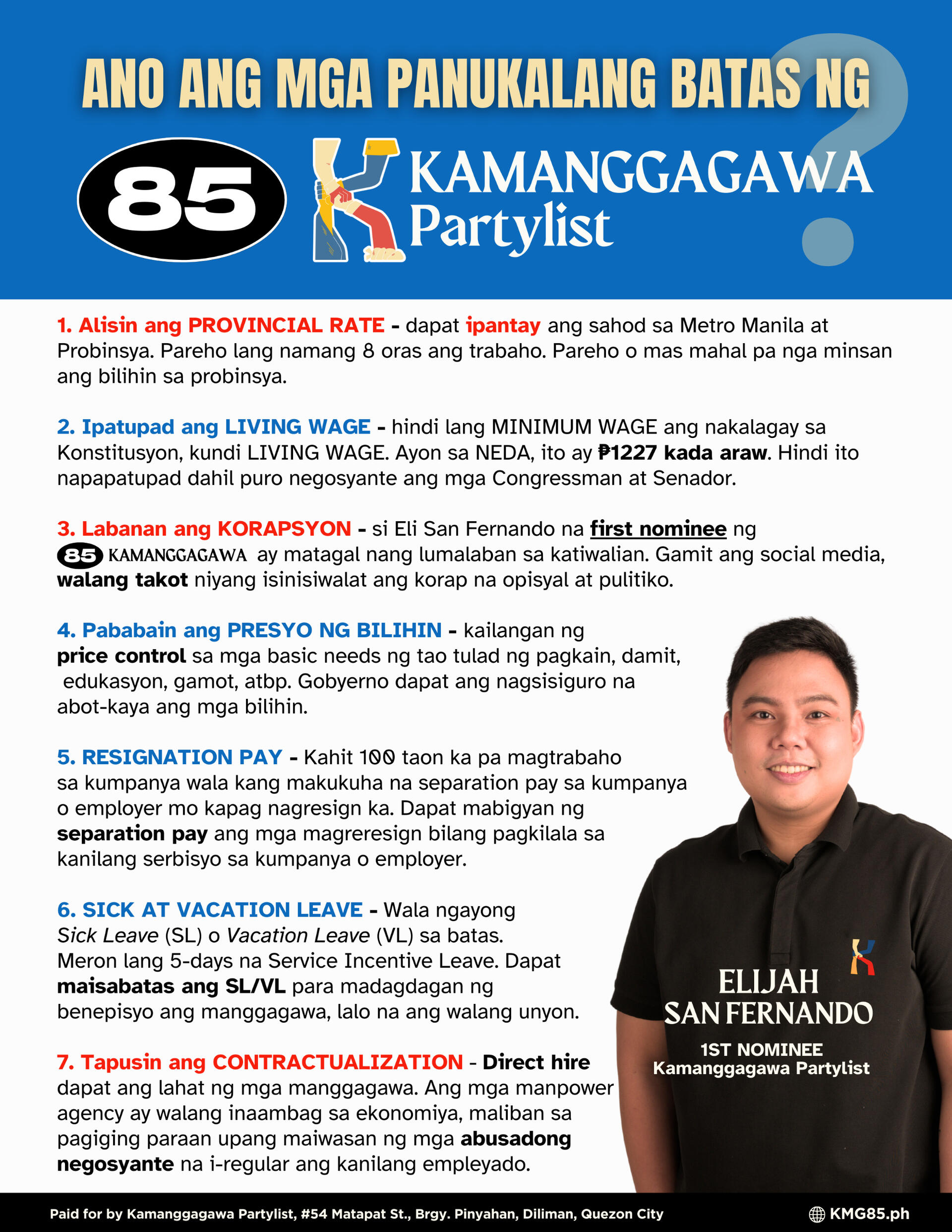 Ang #85 Kamanggagawa Partylist ay tumatakbo sa Halalan 2025 para sa dalawang mahalagang agenda:1. #NoToProvincialRate!